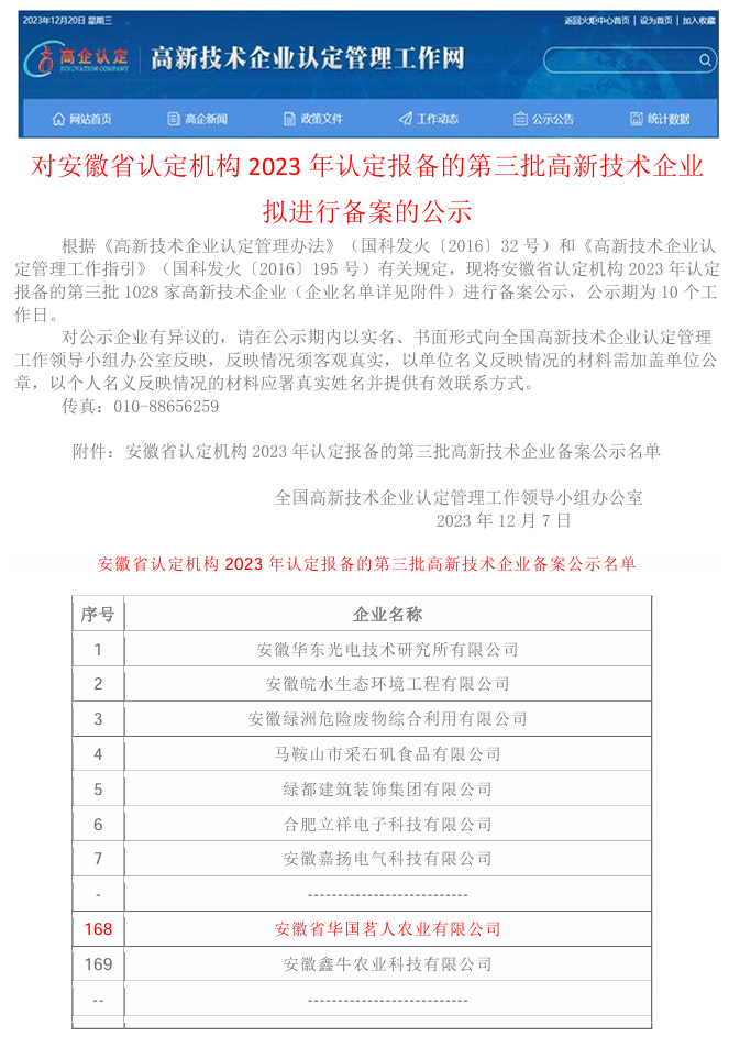 安徽茶葉企業(yè)【華國茗人公司】2023年12月7日被“全國高新技術(shù)企業(yè)認定管理工作領(lǐng)導小組辦公室”認定公示為【國家高新技術(shù)企業(yè)】。是中國黃茶生產(chǎn)企業(yè)為數(shù)不多的榮獲高新企業(yè)榮譽。