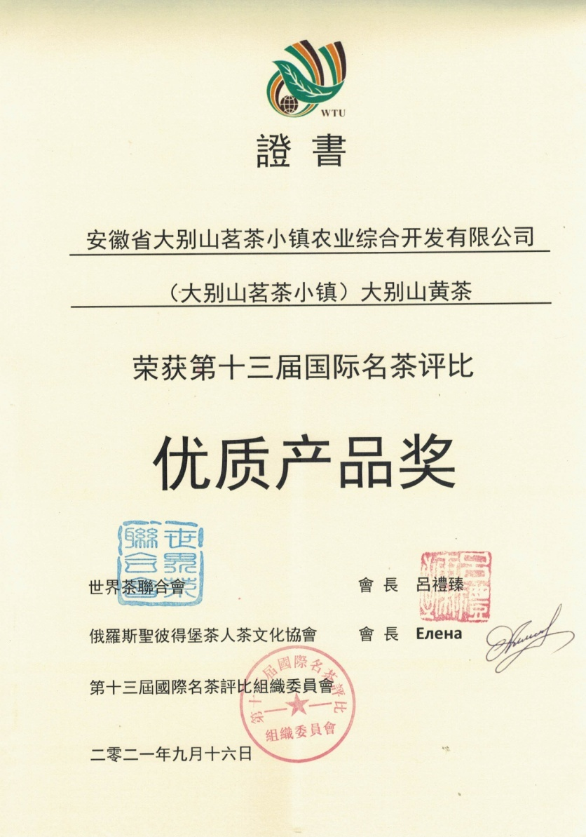 『大別山黃茶』傳承恢復(fù)創(chuàng)制于“大別山茗茶小鎮(zhèn)”,具有獨(dú)特三黃品質(zhì)特征“干茶黃、湯色黃、葉底黃”!敬髣e山黃茶】代表中國黃茶品牌在“第十三屆國際名茶”評(píng)比中“大別山黃茶”獲“國際名茶”優(yōu)質(zhì)產(chǎn)品榮譽(yù)。