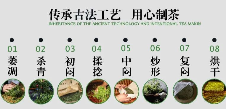 “大別山黃茶”制作工藝:萎凋、殺青、初悶、揉捻、中悶、炒形、復(fù)悶、烘干、等全部采用傳統(tǒng)古法復(fù)雜手工黃茶工藝。